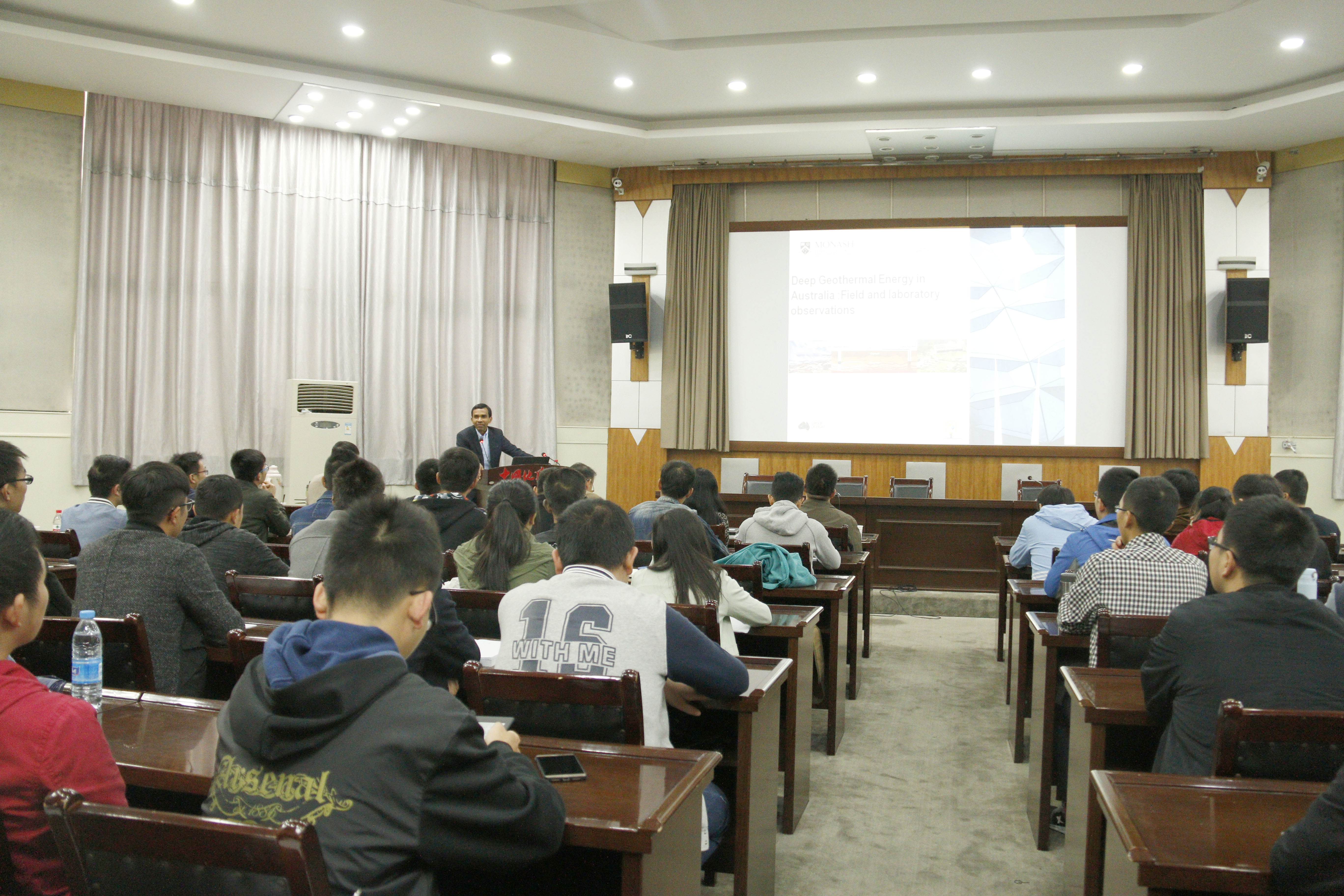 Ranjith教授从地热能发电的巨大潜力入手,介绍了一种增强型地热能源获取系统(EGSs),与传统的化石燃料相比,这种系统更加环保,是一种可再生的能源技术。Ranjith教授通过EGS系统的一些现场观测结果,对EGS系统进行了详细解析,并展示了其团队在EGS系统研究方面的最新研究进展。报告结束后,Ranjith教授热情地回答了师生的提问,他衷心希望能和必赢官网在地热资源开发方面开展合作研究。