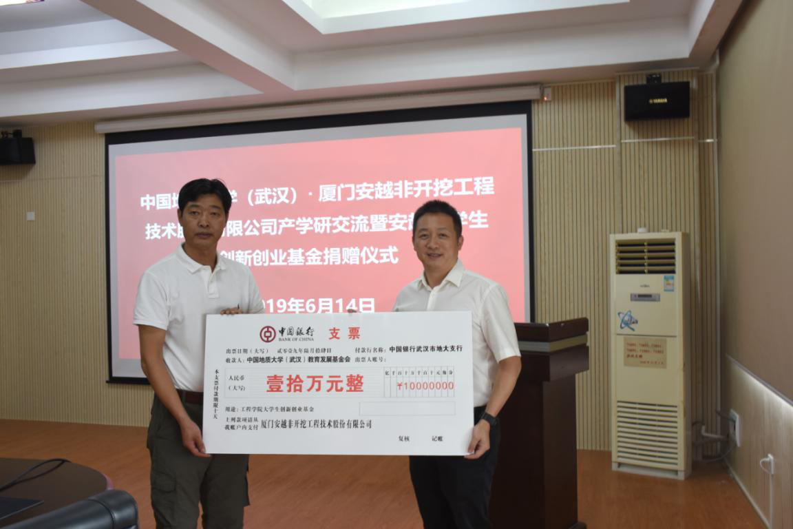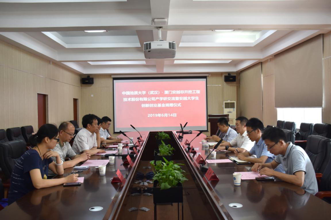 2019年6月14日上午,厦门安越非开挖技术股份有限公司来校作产学研交流,并捐赠10万设立安越大学生创新创业基金,捐赠仪式在315举行。厦门安越非开挖技术股份有限公司董事长廖宝勇一行、武汉中地大非开挖研究院有限公司总经理孔耀祖,校友工作与教育基金管理处副处长吕占峰、丁苗苗,必赢3003no1线路检测中心党委书记陈飞、党委副书记江广长、副教授曾聪参加会议。江广长主持会议。