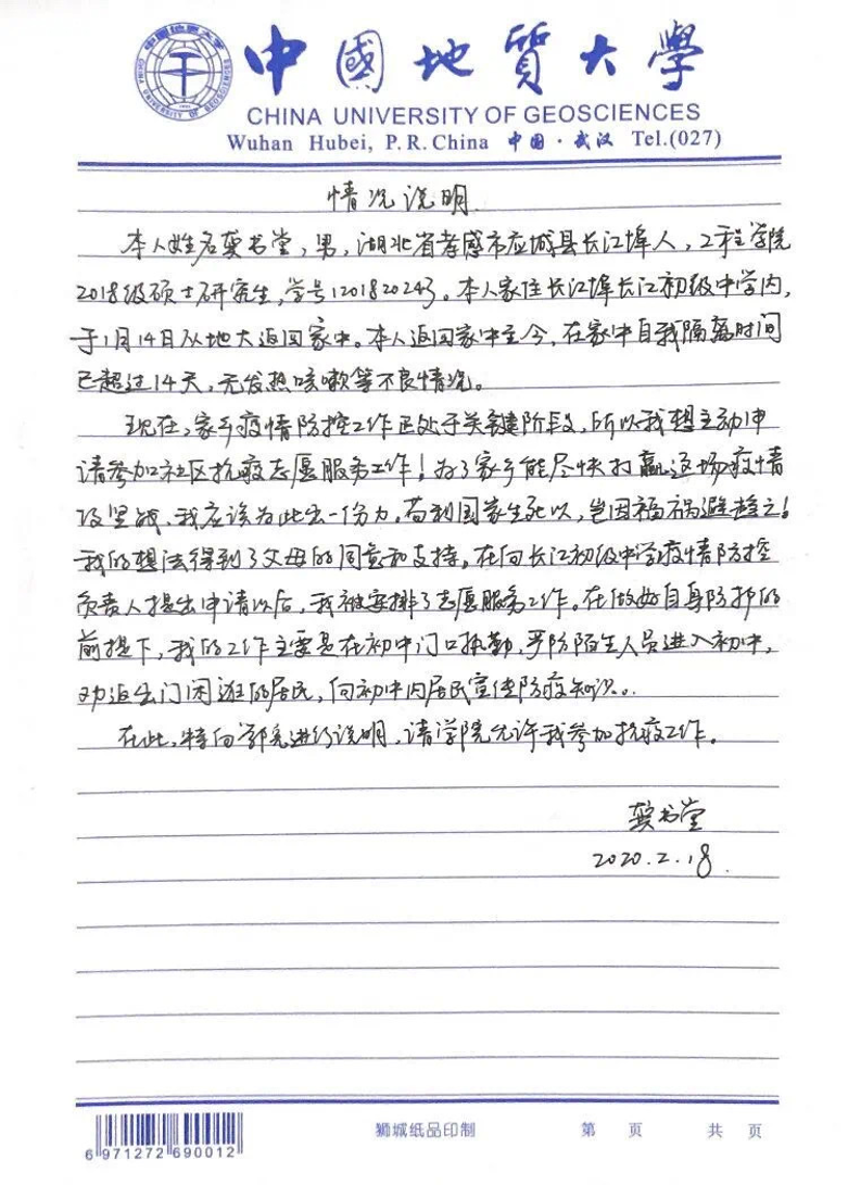 姚文昊 罗卓立 杨昊讯)龚书堂是必赢官网2018级土木工程硕士研究生,他响应学院学校号召,担任抗击疫情一线的志愿者。