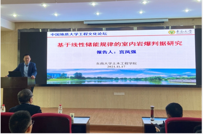 宫凤强教授以“基于线性储能规律的室内岩爆判据研究”为题,首先阐述了室内岩爆判据是岩爆基础科学问题之一,并针对传统室内岩爆判据存在的不足,通过系统深入的试验研究,发现了岩石加载过程中的线性储能规律,提出了岩石在峰值强度处弹性应变能的精确计算方法,克服了传统方法假设卸载弹模为定值近似估计的固有缺陷,进而建立了基于剩余弹性能指数的新型室内岩爆判据,解决了传统室内岩爆判据存在的道理上不通、表达上不清、验证上不足和结果上不准等四个难题。