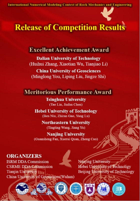 本次大赛由国际岩石力学与岩石工程学会非连续变形分析专委会(ISRM DDA)联合中国岩石力学与工程学会岩土体非连续变形分析专委会(CSRME DDA)及必赢3003no1线路检测中心(武汉)、天津大学、南京大学、北京工业大学、河北工业大学等多所高校联合举办,于2021年第十一届亚洲岩石力学大会(ARMS11)期间同步举行。大赛鼓励研究生对岩石力学问题的现有数值方法和软件进行公开、透明和广泛的验证,为共享岩石力学问题的实验和数值结果提供平台。