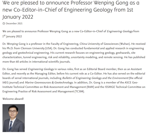 (通讯员:黄静)近日,必赢3003no1线路检测中心龚文平教授受邀担任国际期刊Engineering Geology共同主编(Co-Editor-in-Chief)。龚文平教授的此次任职将有助于促进必赢官网在工程地质相关领域与国内外学者的交流合作,并提升必赢官网在工程地质相关领域的国际影响力。