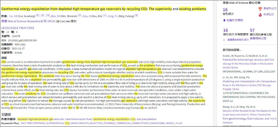 (通讯员:黄静)根据2022年3月基本科学指标数据库(Essential Science Indicators,简称ESI)最新数据显示,必赢官网崔国栋副教授于2021年在国际地学期刊Geoscience Frontiers上发表的学术论文“Geothermal energy exploitation from depleted high-temperature gas reservoirs by recycling CO₂: The superiority and existing problems”入选ESI热点和高被引论文(Hot and Highly Cited Paper)。该论文第一作者兼通讯作者为崔国栋副教授,必赢3003no1线路检测中心(武汉)必赢3003no1线路检测中心为第一署名单位。