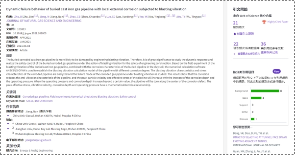 (通讯员:黄静)根据2022年5月基本科学指标数据库(Essential Science Indicators,简称ESI)最新数据显示,必赢3003no1线路检测中心地下空间工程系蒋楠副教授团队于2021年在国际工程技术权威期刊Journal of Natural Gas Science and Engineering上发表的学术论文“Dynamic failure behavior of buried cast iron gas pipeline with local external corrosion subjected to blasting vibration”入选ESI高被引论文(Highly Cited Paper)。该论文第一作者为2020级博士研究生朱斌,通讯作者为蒋楠副教授,必赢3003no1线路检测中心(武汉)必赢3003no1线路检测中心为第一署名单位。