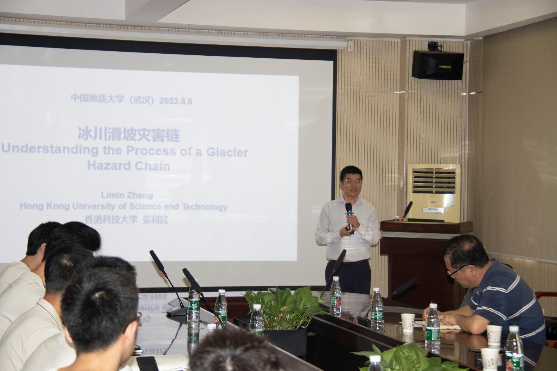 张利民教授作了题为“冰川滑坡灾害链”的学术报告,从物理力学的角度对冰川滑坡灾害链完整过程进行了科学阐释,包括冰川沉积物和岩体在冻融循环下的稳定性丧失、冰溶解过程中的土壤行为、质量流体动力学、碎屑冲击的动态响应以及滑坡灾害链中灾害类型的演变。