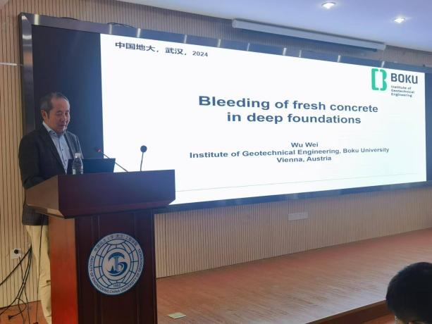 吴伟教授作了题为“Bleeding of fresh concret in deep foundations”的学术讲座。以深基础桩混凝土灌筑为研究背景,阐述了泥浆、钢筋混凝土在生产建设中发挥的重要作用。随后提及混凝土沥水现象,通过图片及视频资料展现了混凝土良好的流动性以及“Bleeding”现象发生的位置,详细介绍了混凝土沥水现象及地下混凝土建筑和桩的破坏现象,介绍了其团队在施工现场测出的混凝土渗水情况,讲述了一立方米混凝土沥水少于20升作为评判混凝土优劣的指标,并对桩基础中混凝土孤立波传播模拟过程进行展示。最后,吴伟教授以反向雨伞为引,介绍了混凝土在水体下降过程中以反向雨伞模型代替球体促使混凝土均匀下降的创新,并且提出了混凝土沥水过程中尚未研究充分的问题,亟待进一步研究。