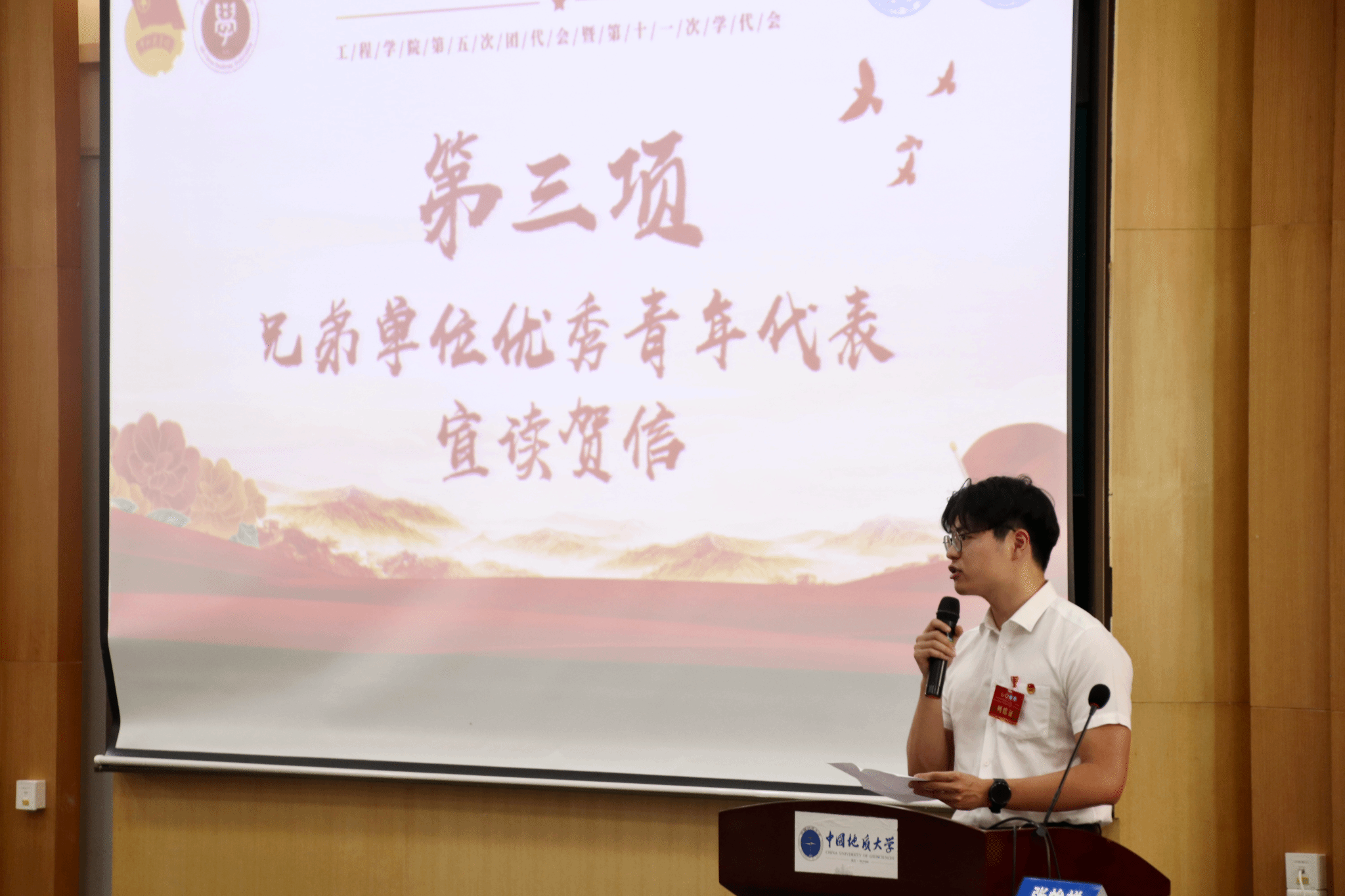 兄弟单位优秀青年代表华中农业大学工学院专职团干贾彦平和2024年全国“青马工程”班委、华中科技大学马克思主义学院硕士研究生张扬分别宣读贺信,贺信中饱含着兄弟院校对必赢3003no1线路检测中心的美好祝愿与深厚情谊,彰显了青年一代团结奋进、携手共进的精神风貌。本次大会还收到了华中科技大学土木与水利必赢3003no1线路检测中心、武汉理工大学土木工程与建筑学院等兄弟高校团委,以及中建三局基建投、武汉地铁集团和中交四航院研究院等企业团组织的贺信。