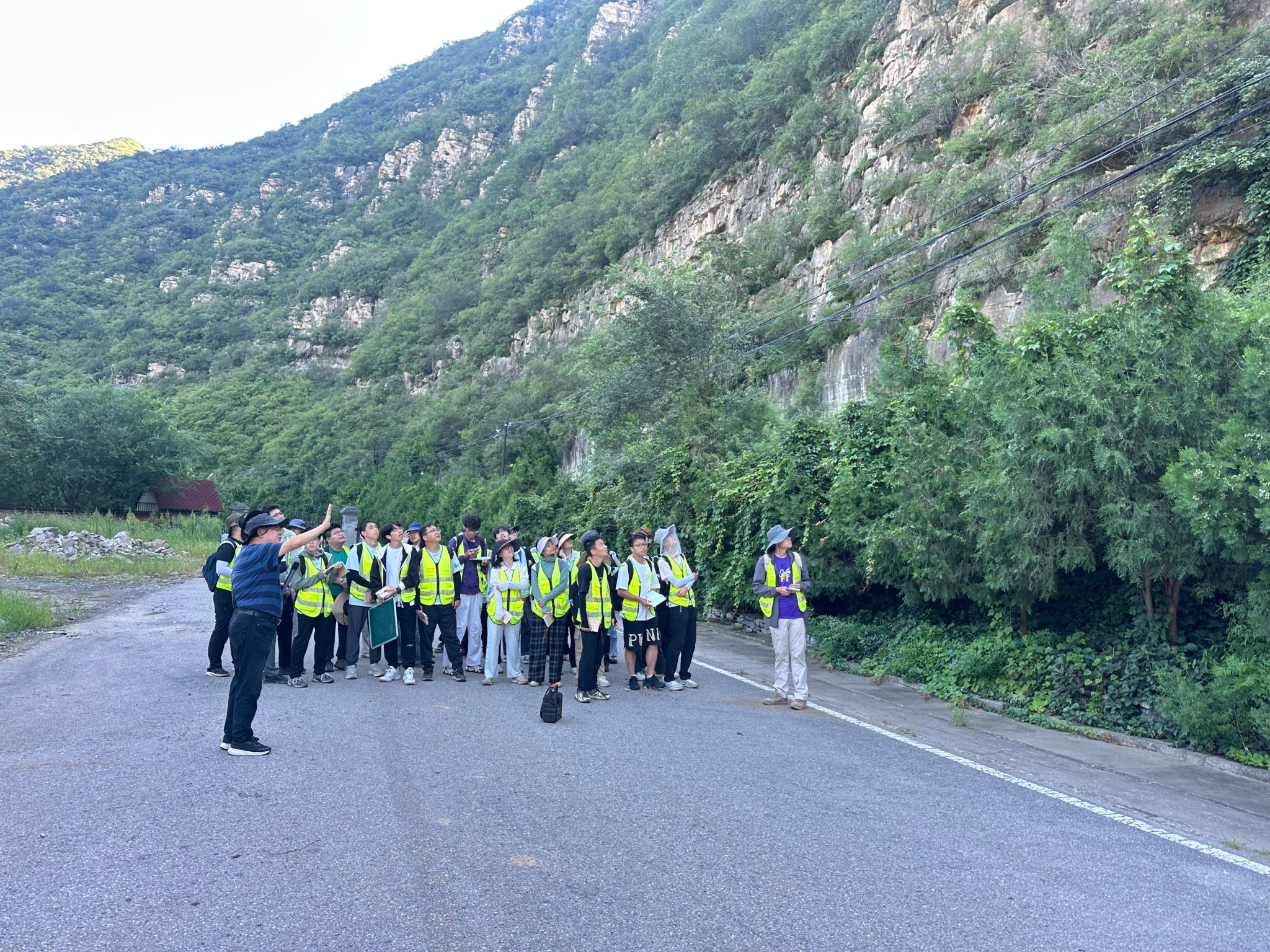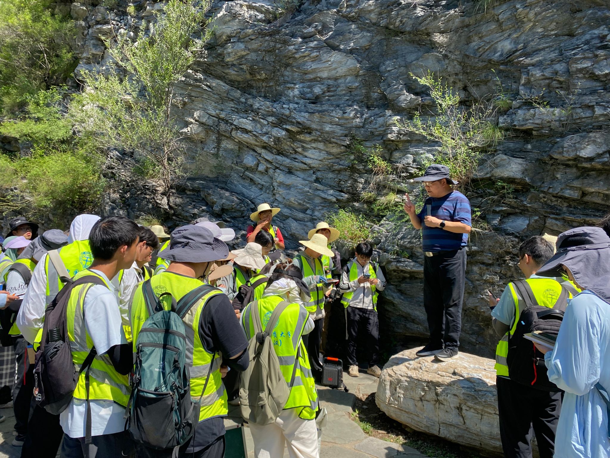 8月10日上午,王亮清一行与实习师生一同前往黄山店实习路线,全程参与野外实践教学。在陡峭的山路上,王亮清与师生共同观察地层构造、分析沉积环境,并结合典型地质现象现场讲解。王亮清强调,周口店实习是地质工程人才培养的关键环节,周口店这本天然教科书,需要以脚步丈量,更需要用创新思维解读。他对同学们提出三点期望:一是以实践锤炼本领,在野外观察中树立“将今论古”的演化思维;二是强化安全意识,通过复杂地质条件下的工程问题模拟训练,提升风险研判与处置能力;三是拥抱技术变革,积极运用AI地质罗盘等智能装备开展野外工作。他指出,作为必赢官网历史最悠久的野外实践基地,周口店实习基地培养了大批优秀地质人才,被誉为“地质工作者的摇篮”,他勉励同学们传承“摇篮精神”,夯实专业基础,为服务国家地质事业积蓄力量。