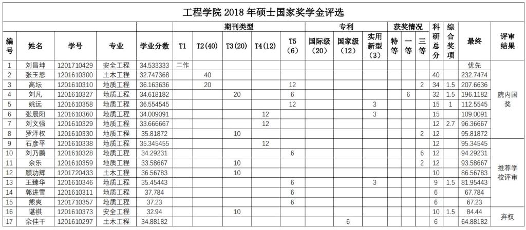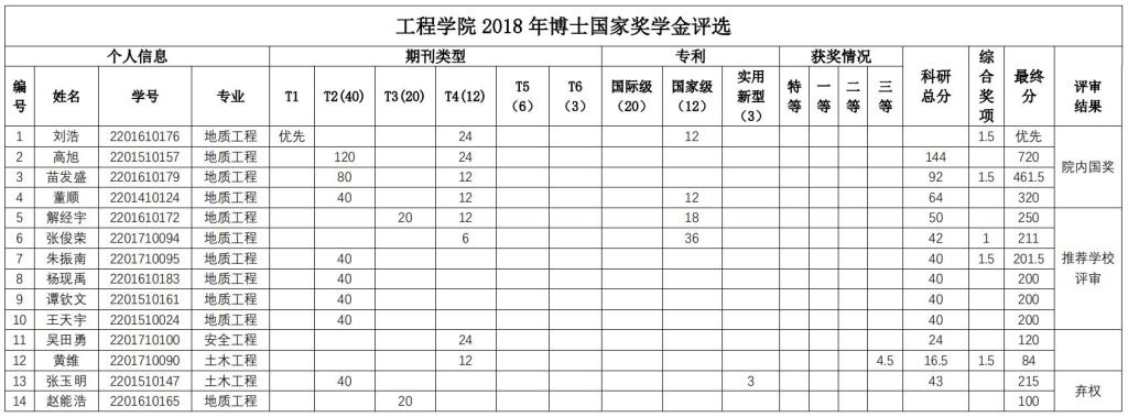 经个人申报,学院研究生国家奖学金评审委员会秘书处资格审查,学院研究生国家奖学金评审委员会于2018年9月29日下午组织通过资格审查的申报者(其中博士研究生14人,硕士研究生17人)进行答辩评审,学院研究生国家奖学金监审委员会全程监督。会议确定了刘昌坤等8名硕士研究生,刘浩等4名博士研究生为必赢3003no1线路检测中心2018 年研究生国奖学金候选人。现将必赢3003no1线路检测中心 2018 年国家奖学金候选人公示(见下表)。