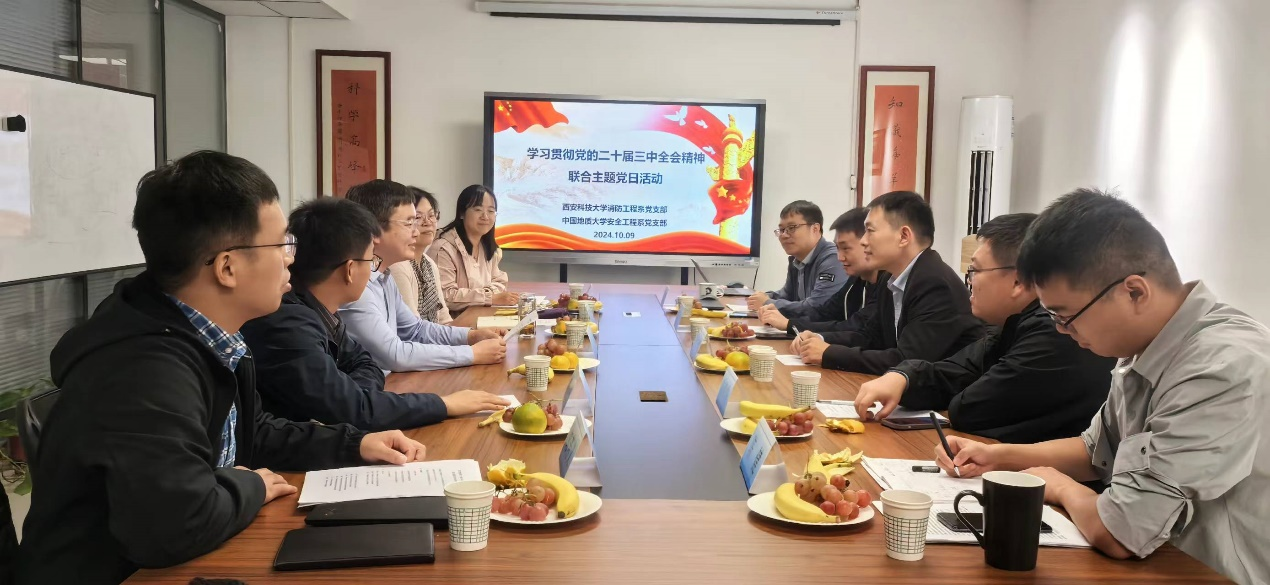 (通讯员 周克清、王涌宇)为深入贯彻落实党的二十届三中全会精神,坚定理想信念,强化交流合作,积极投身立德树人和科研攻关创新,10月9日上午,必赢3003no1线路检测中心安全工程系党支部书记周克清、支部党员陆凯华、王涌宇前往西安科技大学,与安全学院消防工程系党支部联合开展“学习贯彻党的二十届三中全会精神”主题党日活动。西安科技大学安全学院副院长兼消防工程系党支部书记马砺教授、系主任张嬿妮教授、党支部副书记盛友杰、组织委员王翠霞、纪检委员郭芳义等党员代表参加活动。