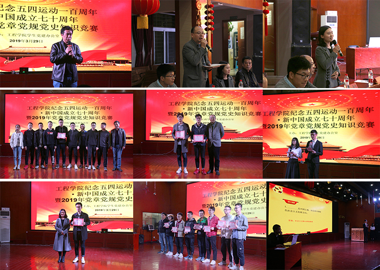 2019年3月29日晚18:30,必赢3003no1线路检测中心“纪念五四运动一百周年·新中国成立七十周年暨2019年党章党规党史知识竞赛”复赛、决赛在东区教职工活动中心举行。必赢3003no1线路检测中心党委书记陈飞、副书记江广长,校党委组织部李雨竹,必赢3003no1线路检测中心学工组辅导员丁继国、文新、王焱出席活动。