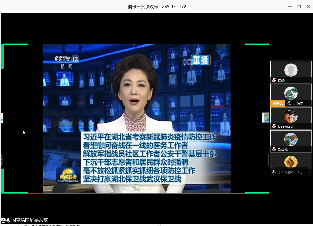 2020年3月26日下午3点至5点,安全工程系党支部在腾讯会议平台开展了主题党日活动。本次活动由党支部书记周克清同志主持,他首先带领党员完成规定动作后,进行本期主题党日活动的主要内容:1)学习习近平总书记在湖北省考察新冠肺炎疫情防控工作讲话精神;2)学习习近平总书记在决战决胜脱贫攻坚座谈会上的讲话精神; 3)学习疫情防控工作先进事迹;4)分享近期工作。