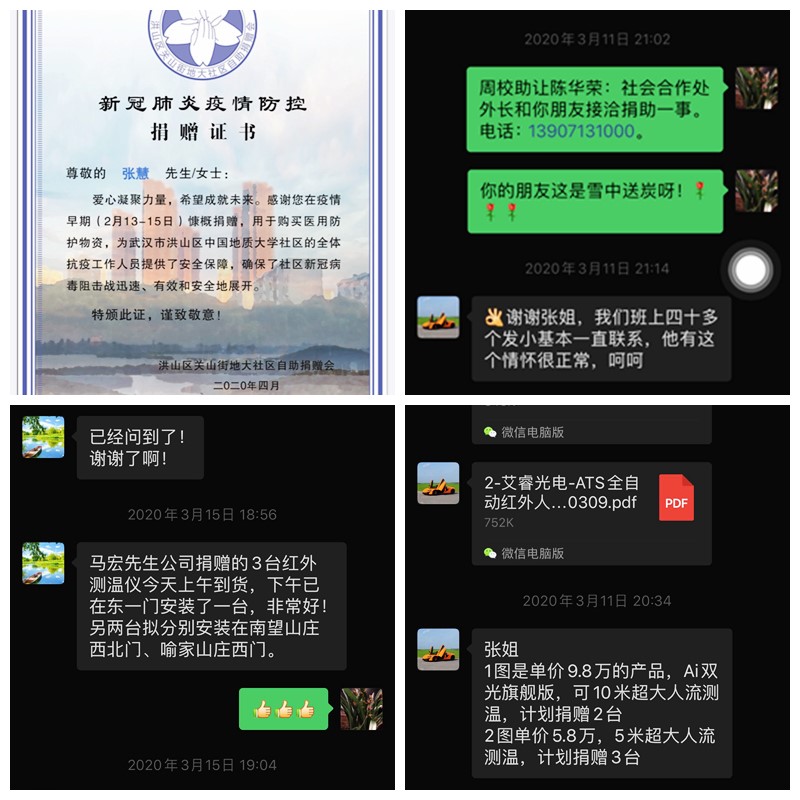 实验中心张慧同志是必赢官网喻家山庄业主委员会主任。疫情爆发后,她迅速联系业委会委员,配合居委会发布通告,及时了解学校及小区居民的发病人员情况。在物业管理人员缺乏,小区消杀物资有限的情况下,组织成立业主自救小组,将业主中的医务人员充实到组织中来。借助学校物业管理的能力对小区的公共区域进行大规模的消杀.多方联系团购渠道,为小区居民提供了便利。进一步完善各楼栋单元的QQ群,摸清现在居住在小区的住户名单及家居人口数。在缺乏防护物质的前提下,不等不靠,组织业主捐款购买护防装备提供给医护人员,保卫人员,社区工作人员,物业管理人员及小区志愿服务人员。在张慧同志的带领和组织下,广大业主积极响应,共筹得善款十七万余元。同时,张慧同志联系到烟台睿创维纳技术股份有限公司的朋友,给必赢官网捐赠了三台ITS智能红外体温检测设备,分别投入到学校东一门、南望山庄西北门和喻家山庄西门使用,大大提高了体温的检测效率和准确性。