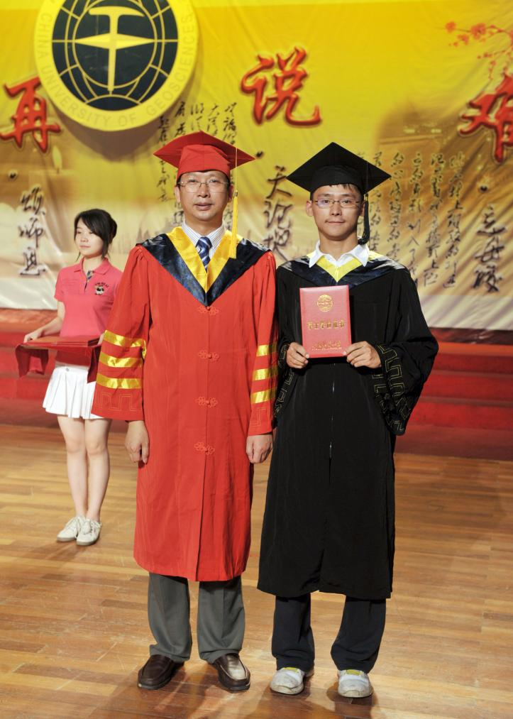 2011年6月,在学校毕业典礼上,学校副校长成金华教授为景浩(右一)颁发毕业证书