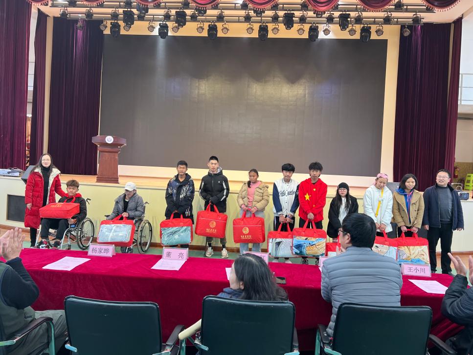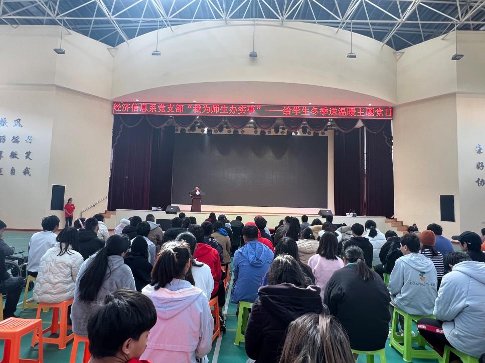 经济信息系党支部于12月24日中午13:00在学校礼堂开展“我为师生办实事”————给学生冬季送温暖主题党日活动。云南特殊职业教育学院党委副书记、院长董亮,党委副书记石红,副院长杨家晔,党委委员、宣传统战部部长张培新,经济信息系党政领导、全体党员、教师代表、入党积极分子和发展对象以及受助同学参加了此次活动。