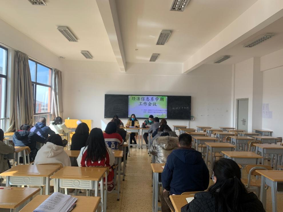 2022年1月6日,经济信息系全体教职工在玉璋楼401召开2021——2022年度秋季学期期末总结和2021——2022年度春季学期工作安排会议。回顾过去一学期走过的历程,总结成绩与不足,展望新学期全新的征途,规划重点和蓝图。会议由教学秘书王艳娥主持。