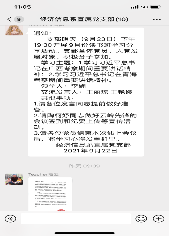 为深入学习习近平总书记在青海、福建的重要讲话精神,重温党的奋斗历程和伟大成就,感悟党的光荣传统和优良作风,传承党的历史经验和时代使命,在学思践悟中做到学史明理、学史增信、学史崇德、学史力行。经济信息系直属党支部于9月23日19时在腾讯会议上开展线上九月主题党日暨专题读书班学习活动。参加人员有支部书记高翠同志、副书记王小川同志等8名党员及32名入党积极分子和发展对象。会议由关雪融同志主持。