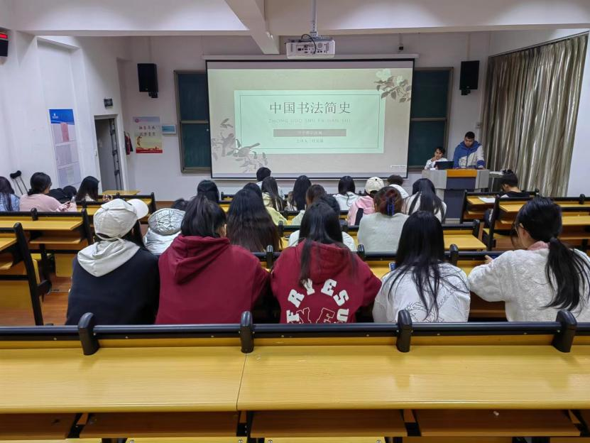 本次分享交流会由云南省硬笔书法协会会员、寻甸书法家协会会员、经济信息系墨韵书法研习会会长任安箭进行分享交流。任安箭同学以中国书法史为背景,先后向同学们讲解了从先秦至明清时期的书法字体演变以及各个时代书法的特点,还带着同学们了解了汉字不同书体的书写方式,以及各朝代书法大家的作品鉴赏。