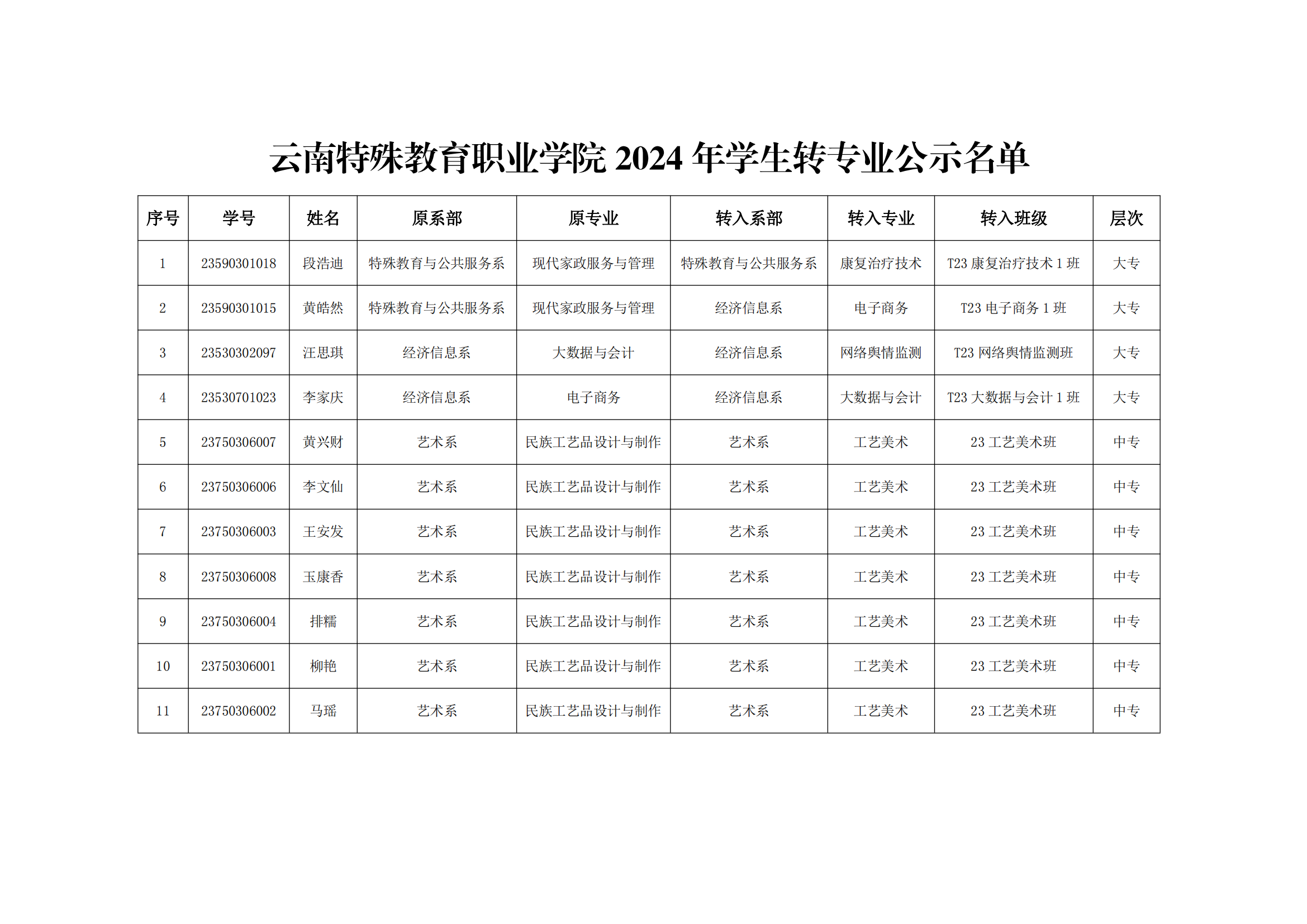 2024年学生转专业名单公示