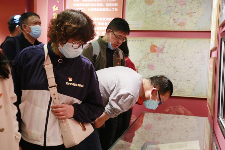 图为参观长征纪念馆展品