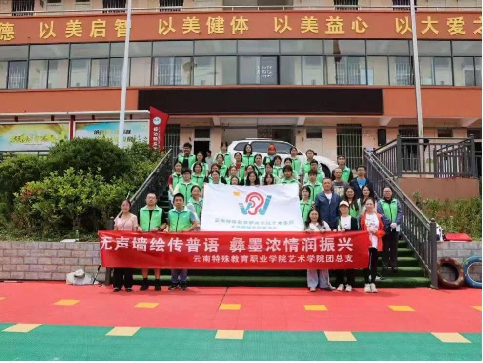 据介绍,beat365英国官方网站艺术学院的4名老师和29名残健学生组成服务队,以“推普+手语+墙绘”为主线展开行动。团队融合健听与听障学生,在禄劝特殊教育学校及多民族杂居的发明村通过墙绘与推普活动,助力校园文化建设及乡村普通话推广。