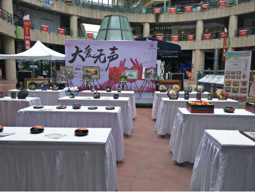 2016年7月6日,校企办应邀参加昆明市顺城购物中心一楼中庭广场的“大爱无声”慈善义卖公益活动。此次活动由IN138主办,现场邀请了省内知名书法家、艺术家进行作品慈善义卖,同时开展了听障青少年才艺表演、听障学生作品现场义卖等活动。活动过程中,beat365听障学生黑陶彩绘作品引得路人驻足观看,纷纷上前询问了解作品的情况及beat365听障学生的学习和生活情况;同时教学实训部人员现场展示了黑陶金丝工艺品的制作技法,并带领观众进行手语互动。