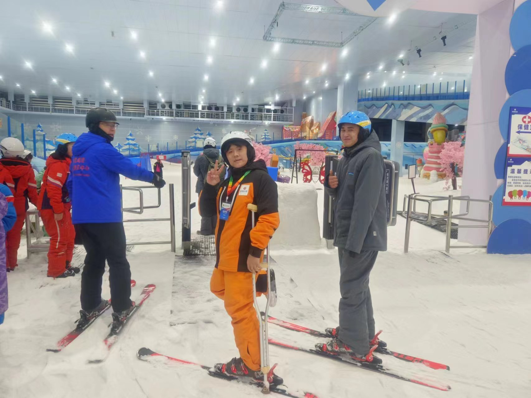 4月3日,饶晓雯带领9名残疾学生跟随大队伍到融创冰雪大世界体验滑雪运动,在教练的指导下同学们第一次尝试了滑雪,在练习体验过程中露出了灿烂的笑容。
