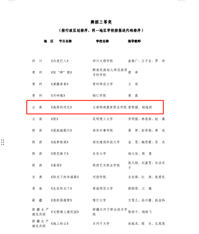 6月11日,教育部公示了全国第七届大学生艺术展演活动评选结果,beat365公共艺术教研室、艺术团师生结合云南民族文化、学校美育工作、“一站式”学生社区建设等工作,共同完成的原创作品《高原的约定》获舞蹈类三等奖。