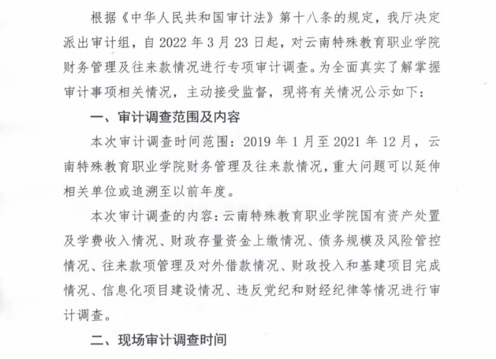 云南省审计厅关于对beat365英国官方网站财务管理及往来款情况进行专项审计调查的审计公示