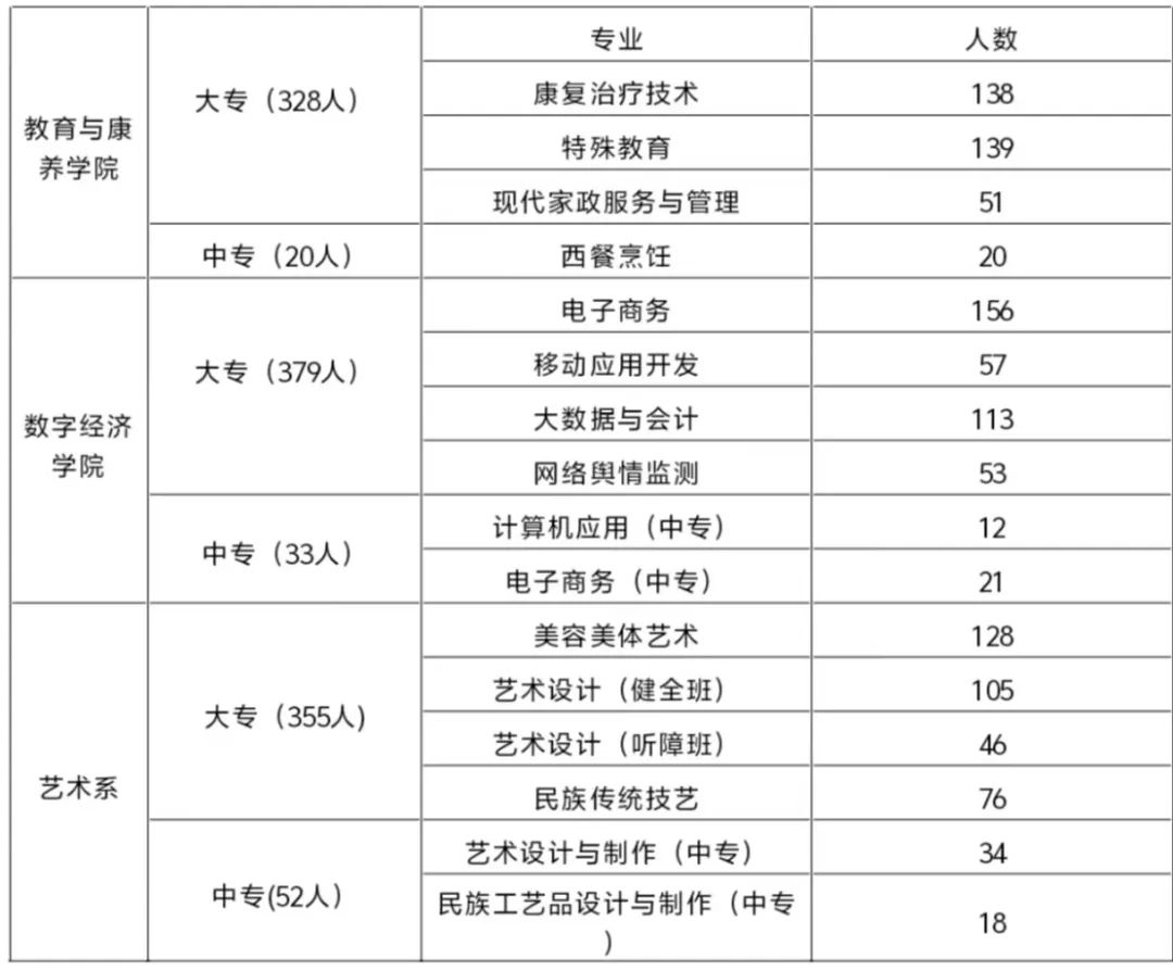 2026届大中专共有1001人,涉及特殊教育、康复治疗技术、现代家政服务与管理、电子商务、大数据与会计、网络舆情监测、移动应用开发、民族传统技艺、艺术设计、美容美体艺术、民族传统技艺、计算机应用专业等。