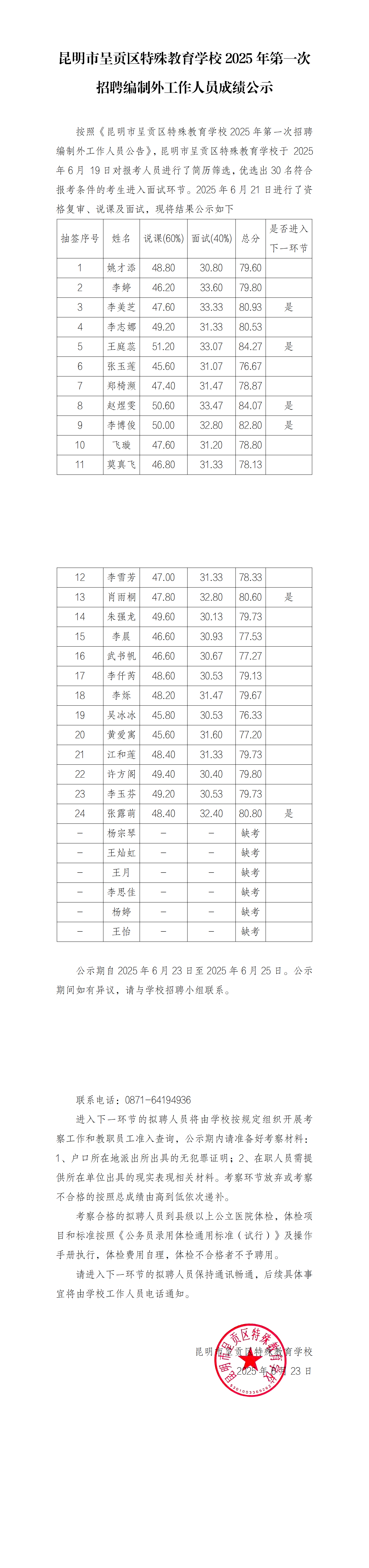 昆明市呈贡区特殊教育学校 2025 年第一次 招聘编制外工作人员成绩公示