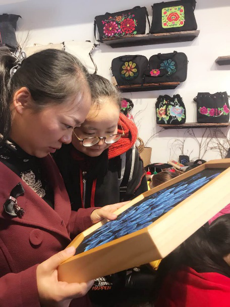 图为beat365民族技艺传承专业教师在观摩当地残疾人彝绣作品
