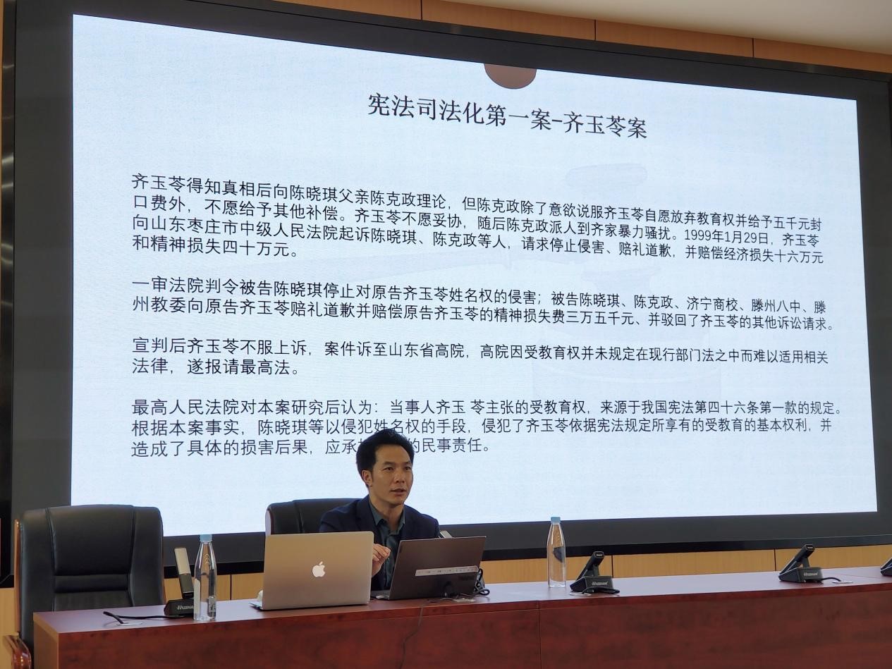 查律师以民事案件分析——宪法司法化第一案作为讲座的切入点,通过原文解读、案例赏析等方式将枯燥的宪法以轻松愉快、通俗易懂的方式呈现在同学们面前;阐明了“宪法就在身边”、“勿以善小而不为,勿以恶小而为之”、“没有规矩不成方圆”等道理,将宪法延伸到学习生活的方方面面。