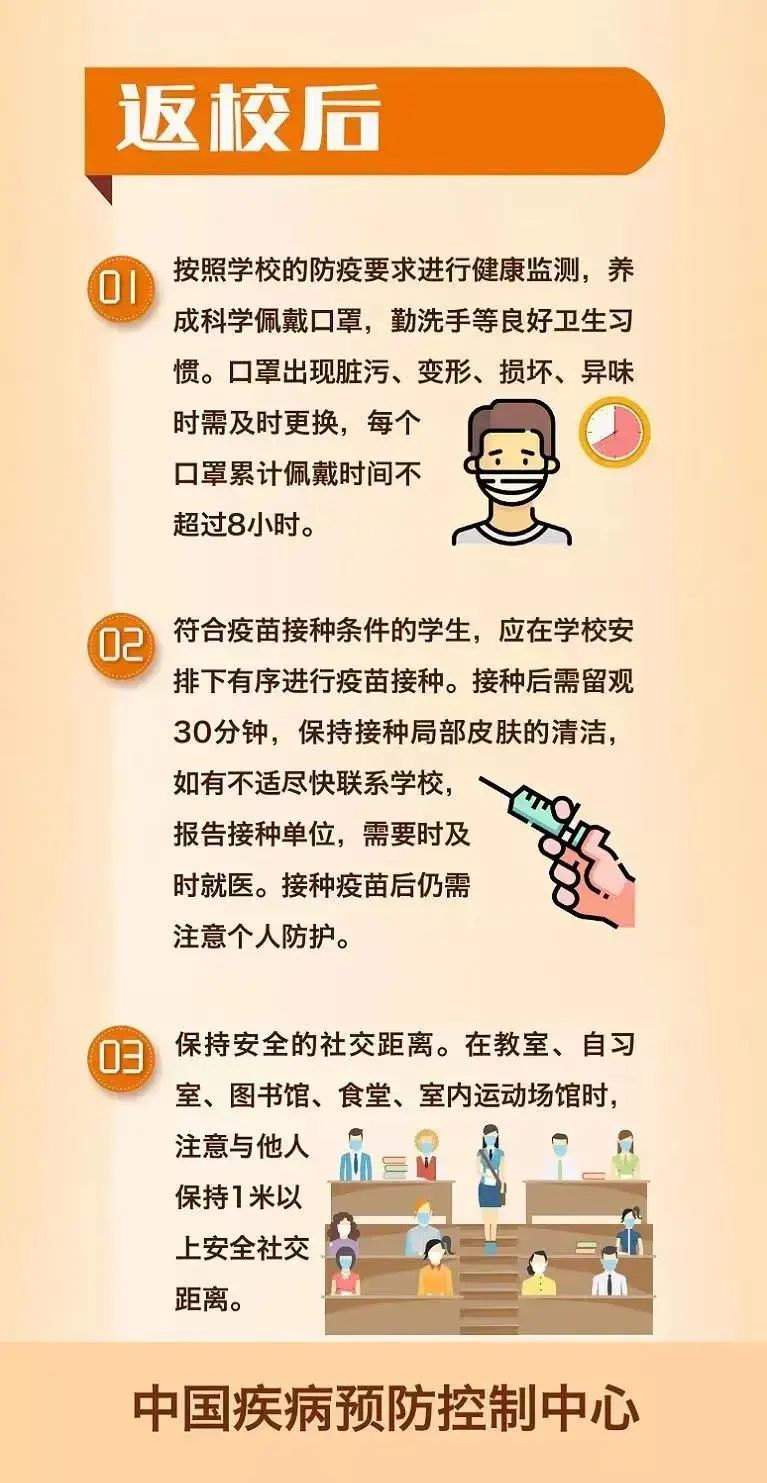 1、返校三周内科学佩戴口罩,在公共场所保持安全距离,保持良好的卫生习惯及健康的生活方式,做好日常防护工作。