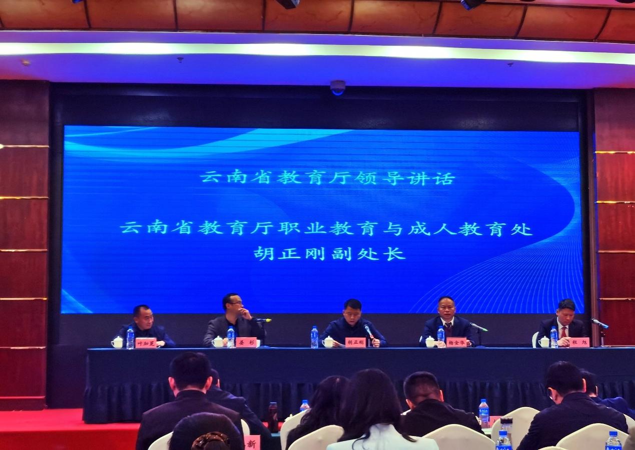 会议分三个阶段:第一阶段由云南交通职业技术学院院长晏杉主持,主办单位昆明冶金高等专科学校党委书记杨金华致开幕辞。云南省教育厅职成教处副处长胡正刚讲话,就高职教育发展当前所面临的问题进行剖析,对高职教育体系建设、高职教育怎么发展、学会怎么办等方面提出个人想法,对近期职教工作安排进行了通报。