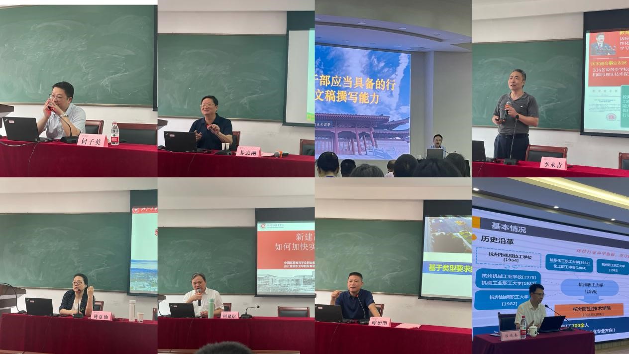 专题辅导中,专家、教授们深入浅出,妙语连珠,活泼的课堂氛围,引人入胜。何子英老师结合丰富的实例,对“新思想、新论断、新部署、新要求”做了生动的讲述;苏志刚书记从高职院校人才培养的现状进行分析,结合多年的丰富工作经验,强调了教师团队建设应与学校专业发展方向紧密结合,并与大家进行深度对话;陈浩主任从“把准机关文字工作的基本定位”出发,以具体的公文为例,详细剖析了公文写作的谋篇布局和语言表达的精准把控;季永青校长从信息化对社会的影响背景切入,为职业院校现代化治理指明了方向;傅夏仙主任以“筑牢理想信念根基”为题,提醒干部要在常学常新中强化理想信念、加强理论修养,在知信行合一中主动担当作为;周建松理事长回溯了我国高职教育的发展历程,为现代职业教育的高质量发展提出了四个方面的总体思路;陈加明教授以“基于类型要求的高水平高职业院校建设”为题,提出了针对高职院校发展的16字教学改革思路。