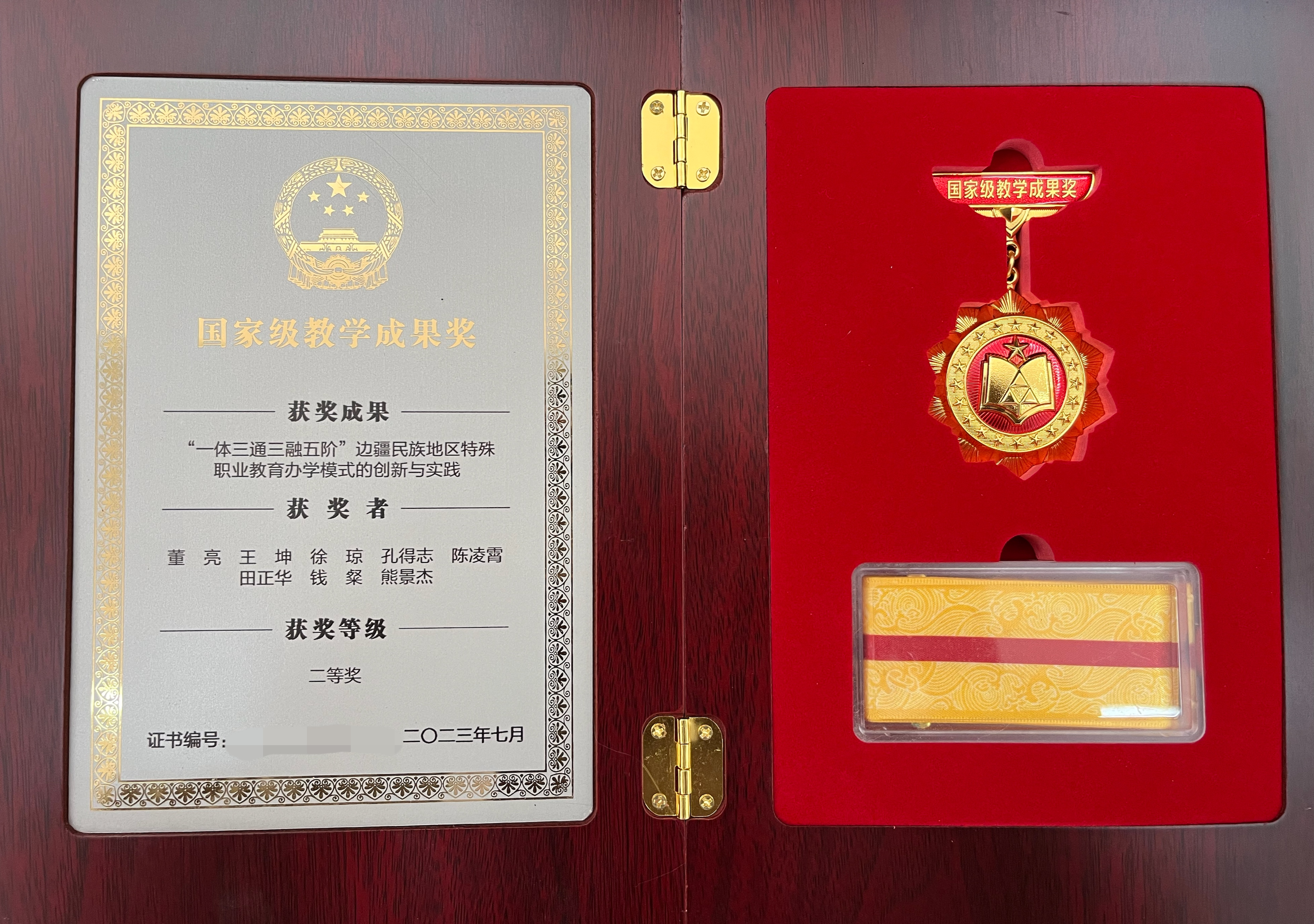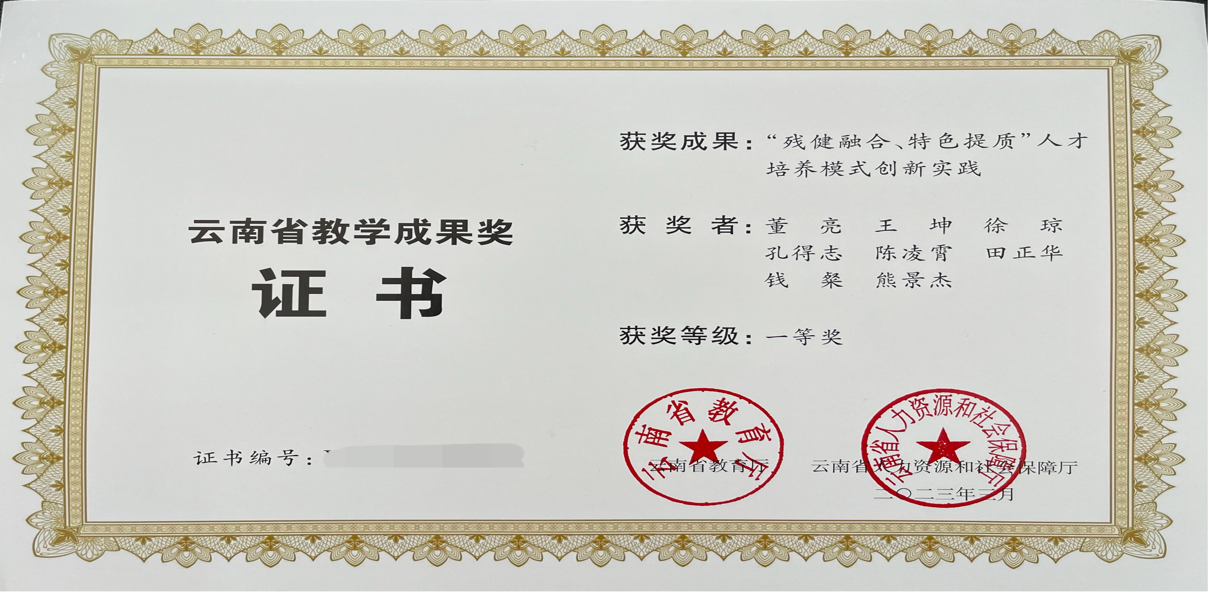 2023年11月22日,云南省教育厅颁发了2022年国家级教学成果奖证书和奖章。继beat365董亮名师工作室牵头完成的beat365英国官方网站教学成果《“残健融合、特色提质”人才培养模式创新实践》荣获云南省教学成果一等奖后,董亮名师工作室再创佳绩,其名师工作室牵头完成的beat365英国官方网站教学成果《“一体三通三融五阶”边疆民族地区特殊职业教育办学模式的创新与实践》荣获国家级教学成果奖二等奖。是对学校近年办学成果的充分认可和肯定,是对beat365特殊教育、人才培养工作和教育教学改革成果的检阅和展示,也是学校深化特殊教育教学改革的标志性成果。