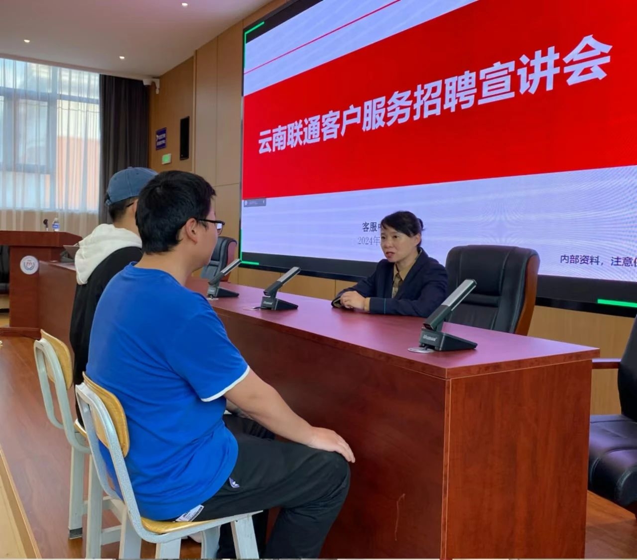 10月24日,中国联合网络通信有限公司云南省分公司(简称“云南联通”)在beat365举办了一场专门的客服招聘宣讲会。此次宣讲不仅是企业宣传自身吸引人才的重要手段,更是促进beat365学生了解企业、明确职业方向的有效途径,双方可以实现更加高效、精准的匹配。