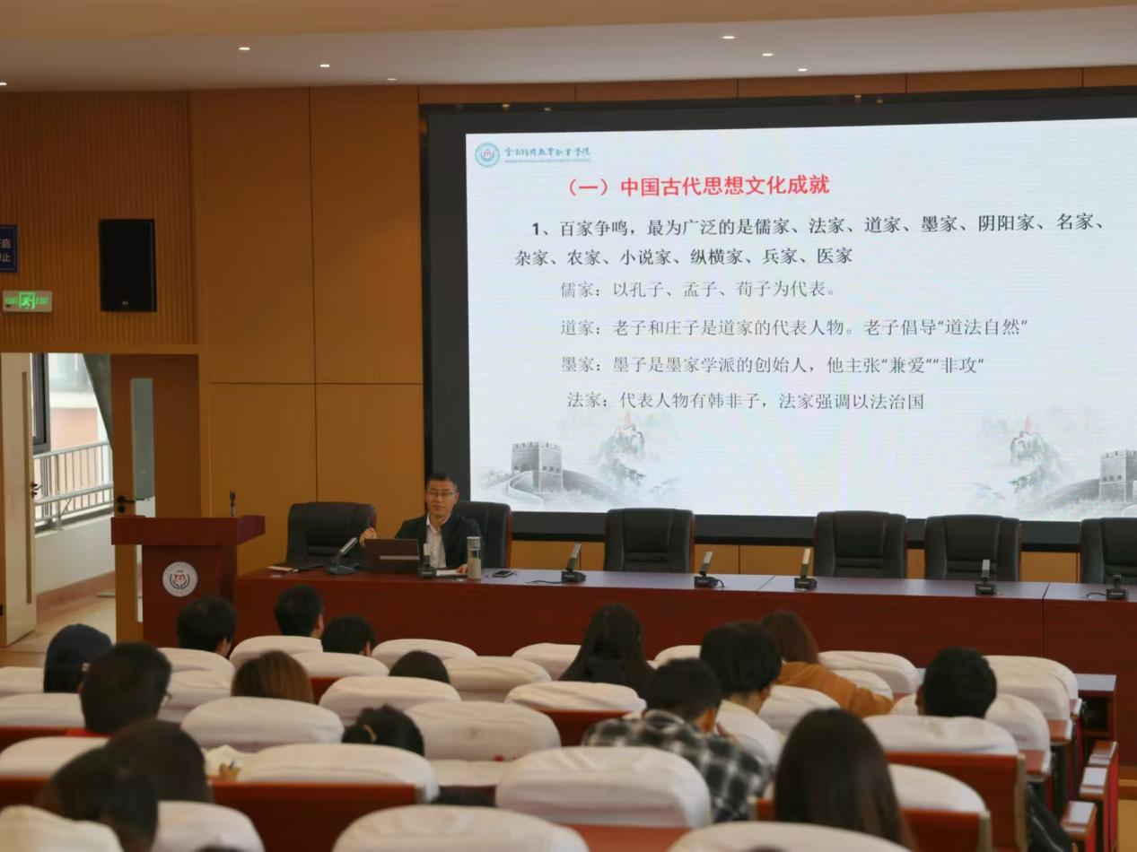 为积极响应党的二十大号召,深入贯彻习近平总书记弘扬中华优秀传统文化的重要指示精神,引导师生深刻领悟中国优秀传统文化的价值,培养爱国情怀、增强对中华文化的认同感和荣誉感, 11 月 20 日,beat365在玉璋楼 408 开展了“诵弦文化讲坛(第八期)————中国传统文化价值的现代应用”专题讲座。此次讲座由李永芳副校长主讲,宣传部部长张培新主持,各系学生代表参加。
