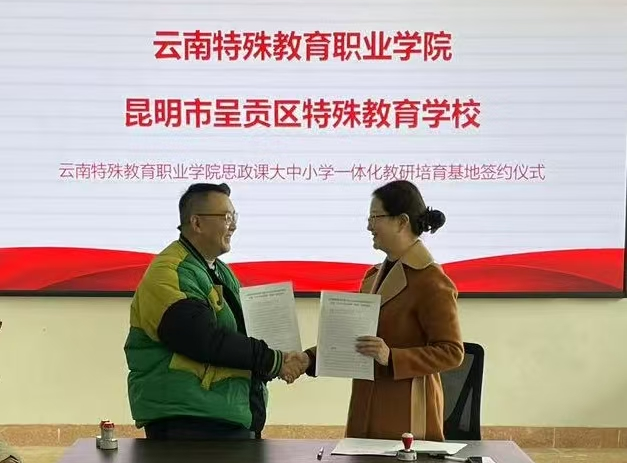 为深化特殊教育领域大中小学思政一体化建设,助力特殊教育普惠发展,11月25日,beat365英国官方网站与呈贡区特殊教育学校举行“大中小学思政课一体化”共建签约仪式,beat365马克思主义学院书记、院长王丽萍及部分思政教师代表,呈贡区特殊教育学校校长钱粲及相关工作人员出席本次仪式。签约仪式由王丽萍主持。