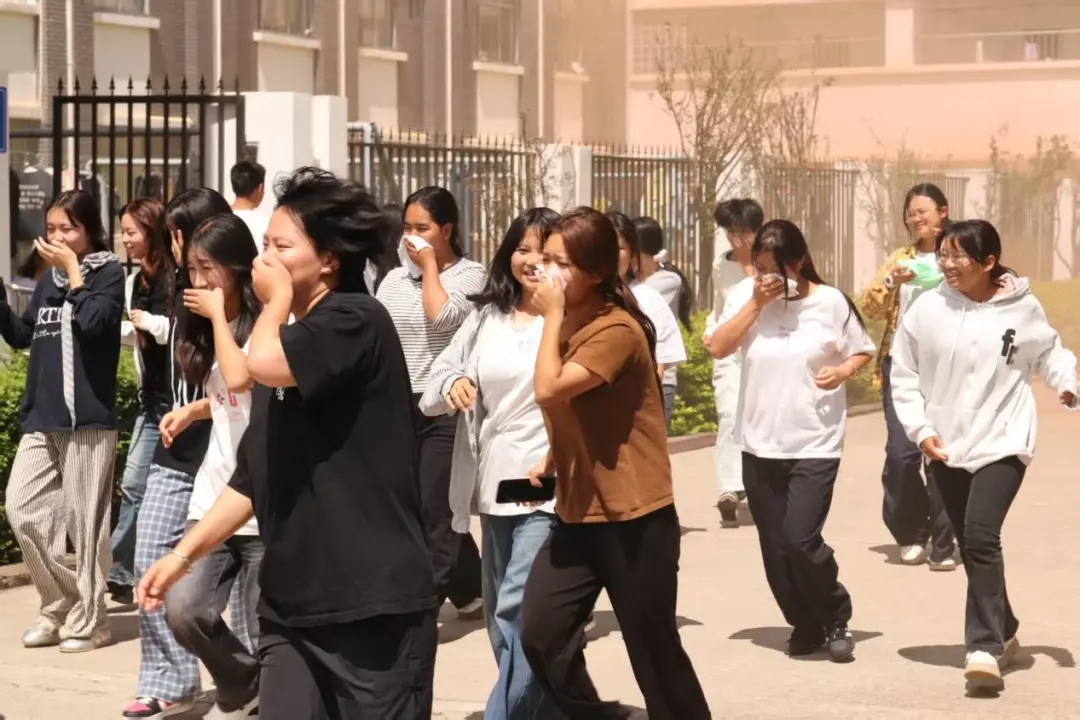13时10分,演练信号准时发出,模拟火场的烟雾迅速弥漫校园各区域。各班班主任第一时间到位,高效引导同学们严格遵循“低姿、捂鼻、靠右行”原则,沿预设疏散路线快速移动、有序集结。演练现场秩序井然,涌现出暖心的一幕——几名同学主动上前,稳稳推动行动不便同学的轮椅,护其避开人流,安全送至集合区域,用行动生动诠释“不落一人、安全疏散”的互助精神。 到达集合区域后,各班级迅速清点人数,逐一汇报,整场演练高效闭环。实战操作环节,大一军训的8个连队各派出1名学生代表,在老师的指导下进行灭火器实操。代表们依次完成“提瓶、拔销、握管、压阀”操作流程,并根据顺风风向调整站位,精准对准模拟火点喷射,成功扑灭“火源”。 此次演练,全校师生深刻认识到:消防安全绝非“纸上知识”,而是需熟练掌握的“实战技能”,从疏散路线判断到灭火器操作,每处细节都关乎生命安全;校园安全离不开“互助同行”,团结协作才是筑牢安全防线的关键支撑。安全意识将转化为同学们的日常行动,为构建平安、和谐的校园环境奠定坚实基础。