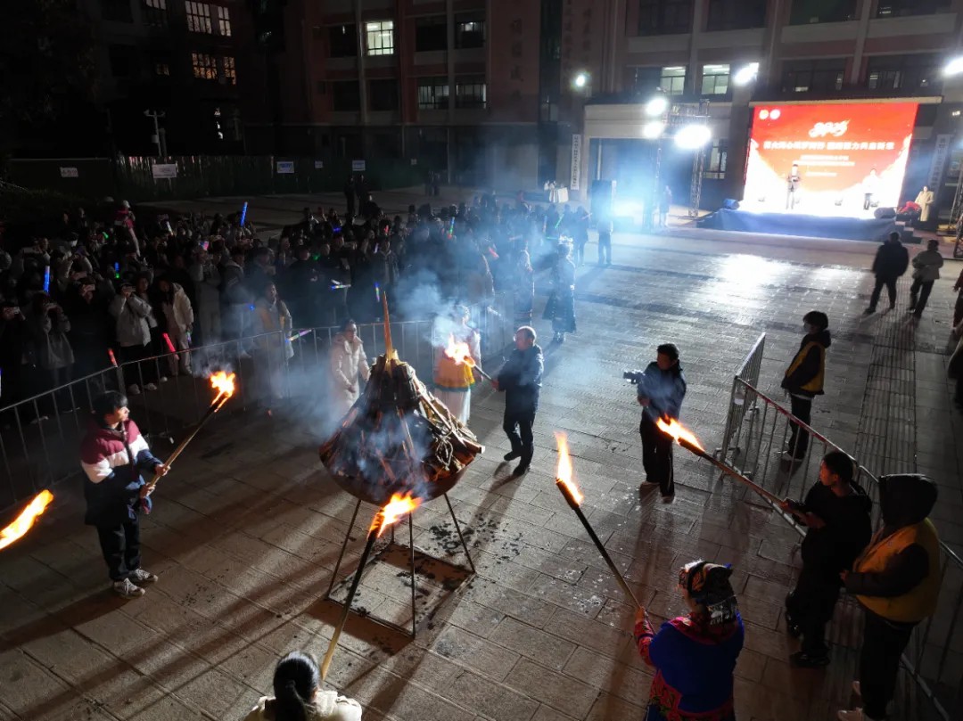 当晚,学校党委书记杨波为晚会致辞。他充分肯定了过去一年全体师生的努力与付出,肯定了“一站式”学生社区文化生活取得的丰硕成果,对未来的发展表达殷切期盼,寄语广大师生团结奋进、同心筑梦,勉励全体师生在新的一年中继续携手前行。随后,杨波书记与学生代表共同点燃象征希望与热情的篝火,将现场气氛推向高潮。