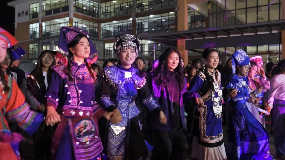 在熊熊燃烧的篝火旁,学校艺术团27名领舞同学与校领导、老师们共同带来第一支富有民族特色的打跳表演,为全场活动热情开场。欢快的节奏、热烈的舞步瞬间点燃了现场气氛,师生们纷纷拉起彼此的手,融入这场跨越民族、温暖人心的集体舞蹈中。活动现场气氛活跃,火光与星光交相辉映,欢声笑语不绝于耳,展现出学校多民族师生和谐共融、积极向上的精神风貌。