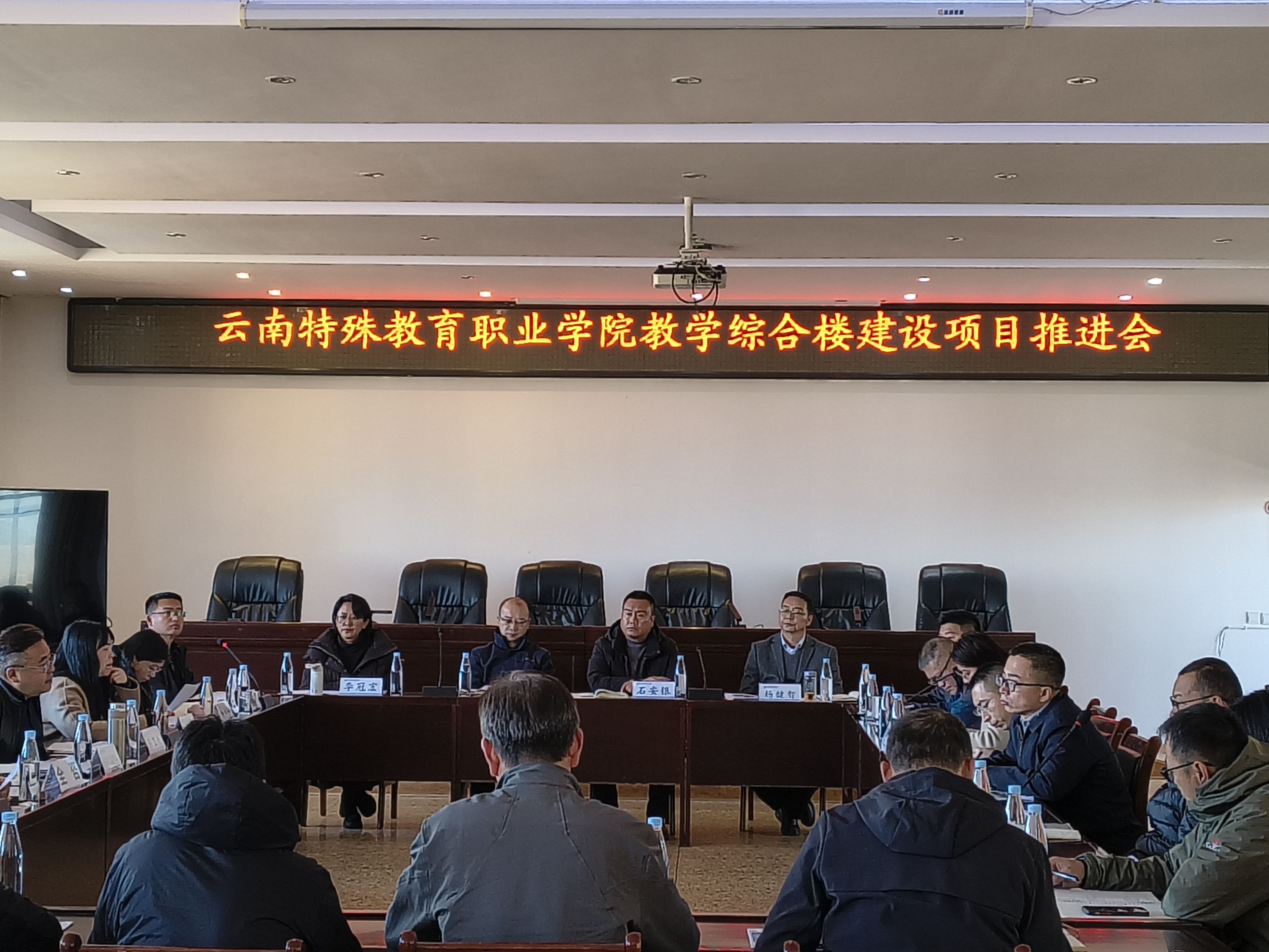 2026年1月14日,beat365英国官方网站召开教学综合楼建设项目推进会。校领导杨波、石安银、李冠宏、杨建智,以及校内相关职能部门负责人、各参建方代表参会。