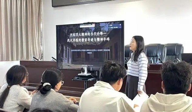 陶老师结合历史影视短片,从西南联大的建校背景和办学历程、解读刚毅坚卓的文化内核、当代精神传承、新时代青年学子的使命与担当等方面,阐释了联大师生是如何在战火纷飞、物资匮乏的年代,走出一条“刚毅坚卓”的教育报国、强国之路。讲座生动展现了西南联大先贤兼容并包、矢志报国的博大情怀,爱国进步人士投笔从戎、奋起抗争的革命精神,师生不畏艰险、奋发图强的精神风貌,以及他们为民族救亡与复兴所作出的卓越贡献。同时,陶老师还介绍了当代青年学子通过组建宣讲团、开展支教活动等形式,传承与践行联大精神的鲜活案例。 站在新的历史起点,西南联大的精神火炬依然明亮。它提醒我们,无论时代如何变迁,对理想的坚守、对国家的热爱、对责任的担当,永远是青春最亮丽的底色。此次讲座回望战火年代的教育史诗,深刻启示后人:教育当与国家同频、与民族共进。西南联大精神历久弥新、永不过时,为师者当立德树人,为学者当厚植家国情怀,践行“中兴业,须人杰”的誓言,将个人使命融入国家发展,以小我之力传承联大精神,以集体之智赓续民族血脉。