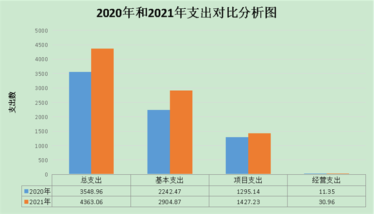 beat365英国官方网站部门2021年度支出合计4,363.06万元。其中:基本支出2,904.87万元,占总支出的66.58%;项目支出1,427.23万元,占总支出的32.71%;上缴上级支出、经营支出、对附属单位补助支出共30.97万元,占总支出的0.71%。与上年对比,基本支出增加662.4万元,项目支出增加132.09万元,上缴上级支出、经营支出、对附属单位补助支出共增加19.62万元,增加主要原因是2021年招生人数增加、职工人数增加,学生培养费用、及教学费用、职工工资福利支出增加。