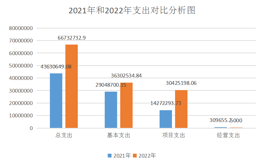 beat365英国官方网站2022年度支出合计66732732.90元。其中:基本支出36302534.84元,占总支出的54.40%;项目支出30425198.06元,占总支出的45.59%;上缴上级支出0.00元,占总支出的0.00%;经营支出5000.00元,占总支出的0.01%;对附属单位补助支出0.00元,占总支出的0.00%。与上年相比,支出合计增加23102083.82元,增长52.95%。其中:基本支出增加7253834.69元,增长24.97%;项目支出增加16152904.33元,增长113.18%;上缴上级支出增加0.00元,增长0.00%;经营支出减少304655.20元,下降98.39%;对附属单位补助支出增加0.00元,增长0.00%。变动主要原因是其一,2022年招生人数增加、职工人数增加,学生培养费用、及教学费用增加,职工工资福利支出增加,导致基本支出增加;其二,由于实训室建设支出增加,因此项目支出增加。其三,由于手语培训开展班次、原合作办学项目减少,导致经营支出降低幅度较大。
