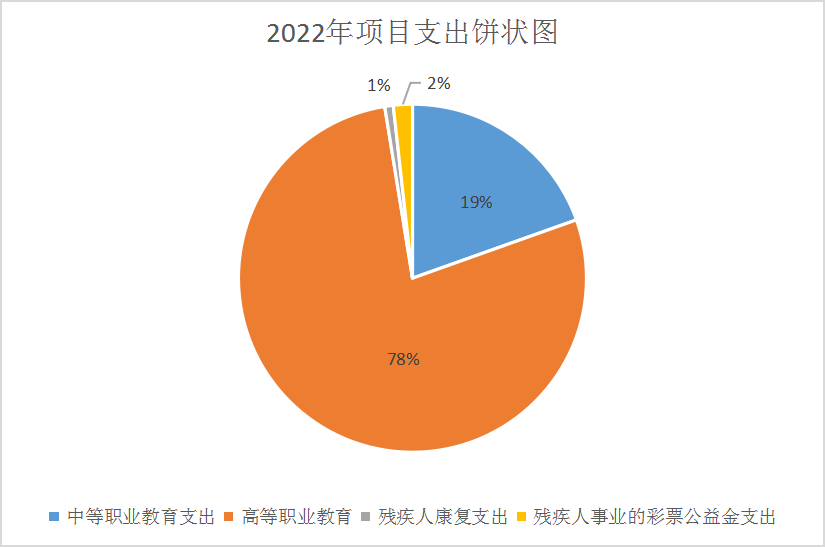 2022年度用于保障beat365英国官方网站完成特定的行政工作任务或事业发展目标,用于专项业务工作的经费支出30425198.06元。其中:基本建设类项目支出0.00元。具体项目开支及开展工作情况:1.中等职业教育支出5951945.97元,占项目支出19.56%;2.高等职业教育23696452.09元,占项目支出77.88%;3.残疾人康复支出238400.00元,占项目支出0.78%;4.用于残疾人事业的彩票公益金支出538400.00元,占项目支出1.77%。