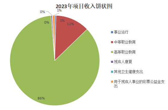 2023年度用于保障beat365英国官方网站单位为完成特定的行政工作任务或事业发展目标,用于专项业务工作的经费支出2595.51万元。其中:基本建设类项目支出0.00万元。具体项目开支及开展工作情况:1.事业运行支出12万元,占项目支出0.46%;2.中等职业教育支出320.31万元,占项目支出12.34%;3.高等职业教育2228.27万元,占项目支出85.85%;4.残疾人康复支出11万元,占项目支出0.42%;5.其他卫生健康支出4万元,占项目支出0.15%;6.用于残疾人事业的彩票公益金支出19.93万元,占项目支出0.77%。