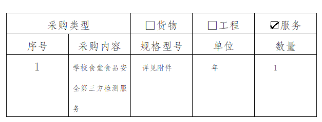 为进一步加强校园食品安全管理工作,提高学校食堂食品安全卫生水平,学校引入食品安全风险评估及监管服务。旨在以预防为主,通过第三方的食品安全检测进行风险评估,掌握学校食堂食品安全的总体状况,及时发现问题,落实食品安全责任制和责任追究制,提高学生餐饮食品安全水平,预防重大食品安全事故的发生。采购需求详见清单: